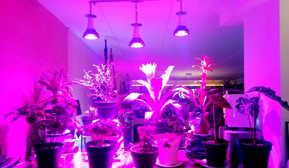 Niinpä sain Vplux Oy:ltä kolme 54W spotti kasvilediä E27 kannalla, jotka antavat sekä punaista että sinistä valoa. Silmään valo näkyy violetin värisenä. Kaikki eivät valon väristä pidä, mutta minua se ei haittaa. Mielestäni jotkin kasvit näyttävät todella kauniilta purppuravalossa. Puna-sininen valo stimuloi kasveja myös kukkimaan paremmin, kuin pelkkää sinistä valoa antavat valaisimet.