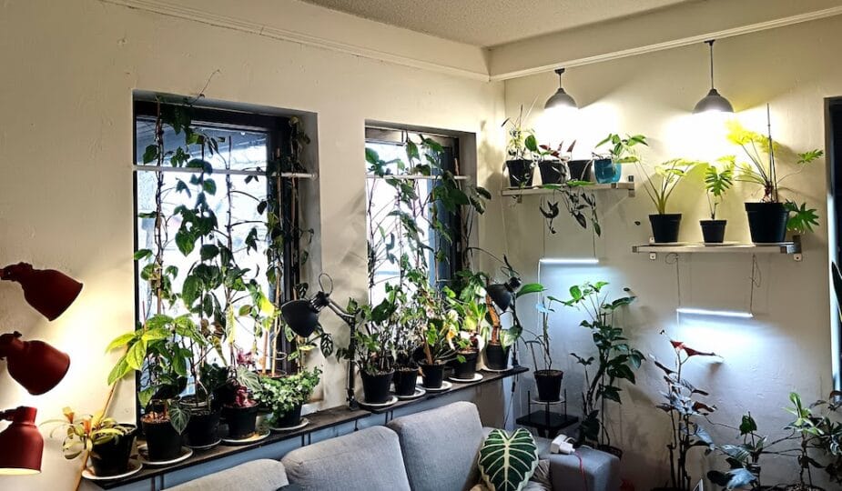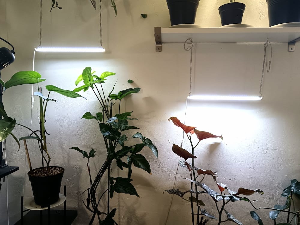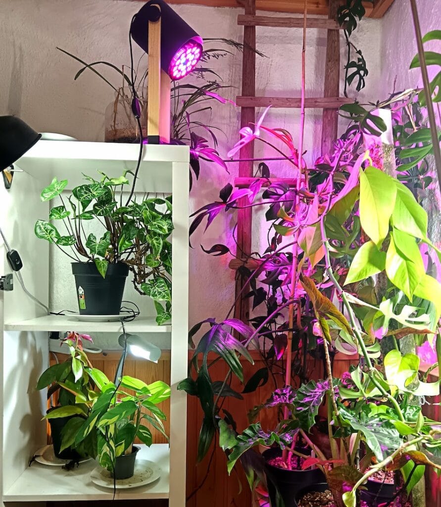 Kun kasveja on toistasataa, eivät ne kaikki mahdu ikkunoille. Lisäksi osa ikkunoista on kuistin katon ja puiden varjostamia. Niinpä olen ratkaissut sijoitteluongelman kasvivaloilla. Tällä hetkellä kodissamme on kolmisenkymmentä lamppua kasveilla. Laskin joskus lamppujen sähkönkulutusta ja ne veivät silloin sähköä vajaalla eurolla päivässä. Valot palavat ajastimien avulla 9-12 tuntia päivässä.
