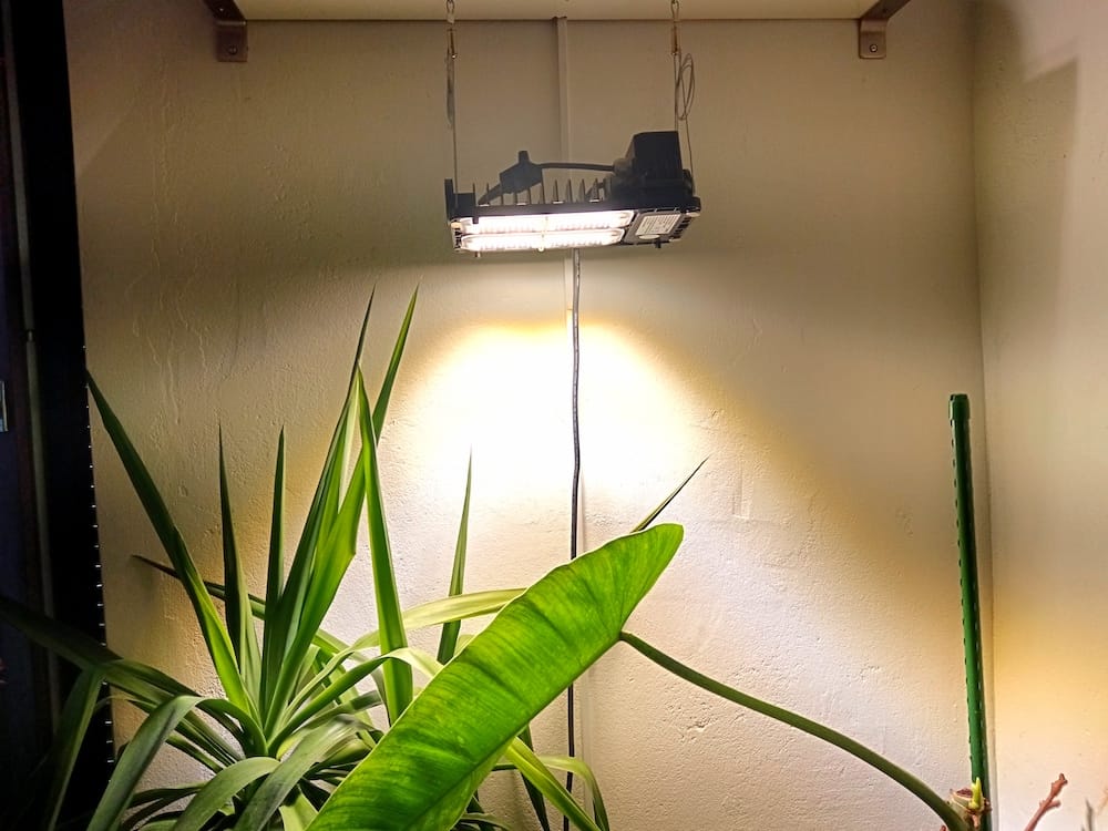 Kiinanruusulla on Hortimolin 40W led paneelikasvivalaisin. Kiinari on suuri, joten lampussakin pitää olla hieman enemmän ytyä. Sain valaisimen koekäyttöön vuosia sitten Vpluxilta ja olen ollut enemmän kuin tyytyväinen siihen. Kiinari kasvaa kauheaa vauhtia ja sitä saa leikellä vähän väliä, jotta se mahtuu paikalleen. Kiinari on myös kukkinut kohta kaksi vuotta putkeen. Valaisimessa on kasveille sopiva täysi spektri, joten se antaa kasville oikeassa suhteessa oikean väristä valoa.