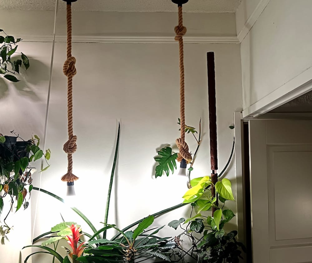 Köysikattovalaisimien ostopaikkaa en enää muista. Niitä löytyy mm. Kasvikuplasta. Valaisin on siitä hauska, että sitä voi lyhentää tekemällä siihen solmuja. Omissani on E27 kanta ja lamppuna Airamin Superlux. Superluxeja on myös pöytävalaisimissa, jotka on ostettu Ikeasta. Ne saa kiinnitettyä pöydän tai hyllyn laitaan ja valoa on helppo suunnata kääntyvän pään takia.