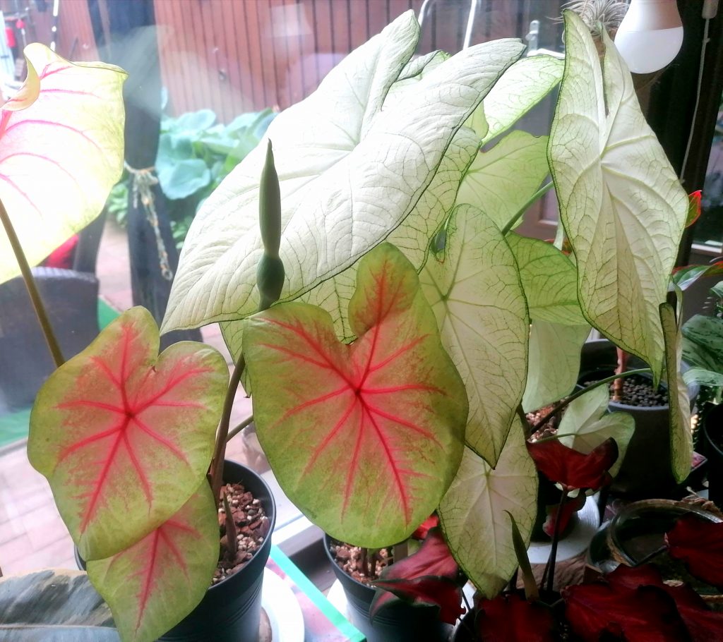 Caladiumit kukoistavat näin kesällä, mutta kuolettavat lehtensä talven tullessa.