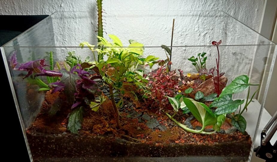 Vajaa vuosi sitten tein pieneen kannettomaan terraarioon minipuutarhan. Laatikon pohjalle laitoin reilu sentin paksuudelta hydrosoraa, jonka päälle laitoin hyttysverkkoa, joka estää hydrosoran ja kasvupohjan sekoittumisen. Tein sorakerroksen salaojaksi liikavedelle, mikäli kastelen terraariota liikaa. Kasvupohjaksi laitoin kookosta, perliittiä, hydrosoraa ja hieman kaarnaa (Orkideamulta). Laitoin kasvupohjaa noin 10 cm ja tein yhteen nurkkaan kasvupohjasta kumpareen.