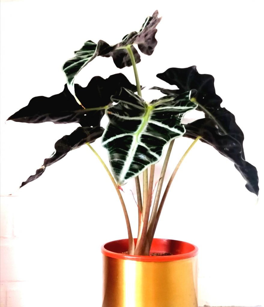 Alocasia Pollyn lehdet ovat hyvin tummanvihreät, lähes mustat. Alapinnaltaan ne ovat tumman purppurat. Lehdillä on erikoinen sahalaitainen nuolen malli.