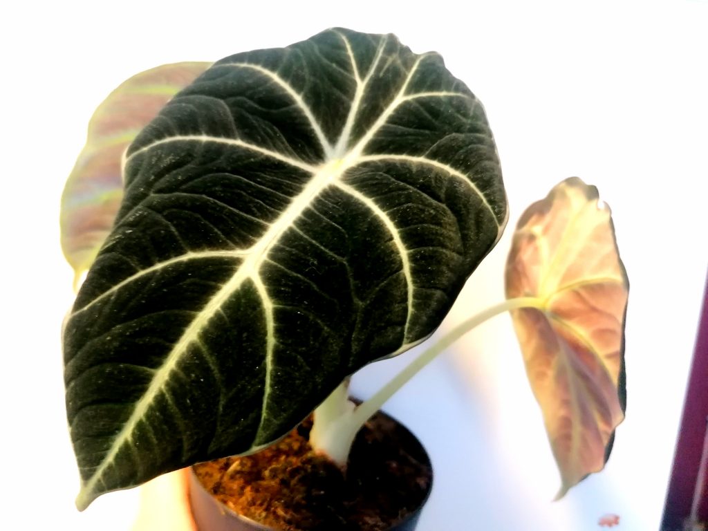 Alocasia ”Black Velvet” omistaa nimensä mukaisesti lähes mustat samettipintaiset lehdet. Kasvi ei kasva kovin suureksi.