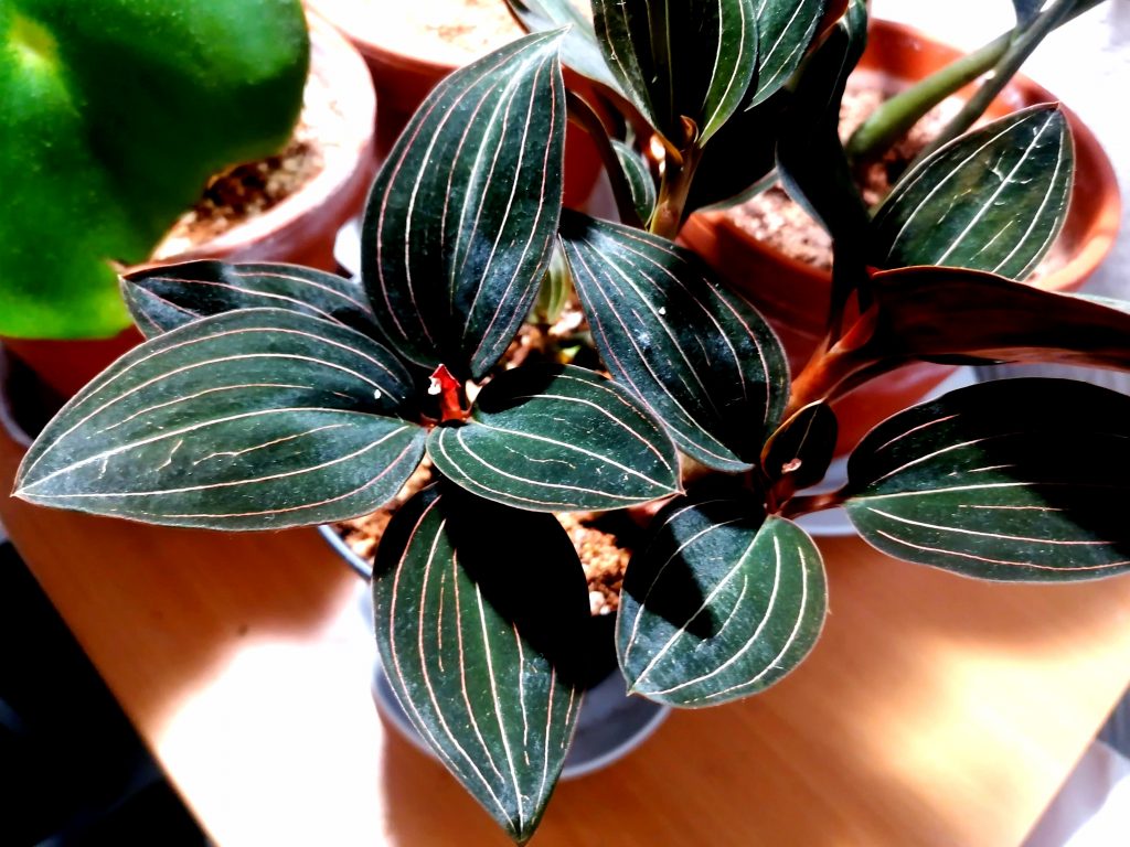 Jalokiviorkidea Ludisia Discolorin lehdet kiiltelevät jossain mustan ja vihreän välimaastossa. Kauniit kiiltävät raidat koristavat samettipintaisia lehtiä.