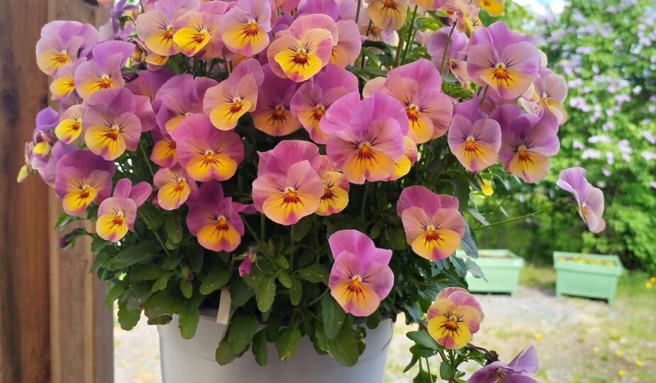 Ostin aivan ihastuttavan orvokkiamppelin toukokuun alussa Tampereen messukeskuksessa olleilta Piha & luonto- messuilta. En ollut aikeissa ostaa kesäkukkia messuilta, mutta en onnistunut kävelemään tämän ohi, kun bongasin sen orvokkirivistössä eräällä myyjällä. Amppelin orvokeilla on herkät, vaaleanvioletti-keltaiset kukat, joissa on häivähdys vaaleanpunaista. Amppeli kasveineen maksoi muistaakseni kympin. Sijoitin sen kuistin portaiden kaiteen yläpuolelle, missä se saa reippaasti aamupäivän aurinkoa.