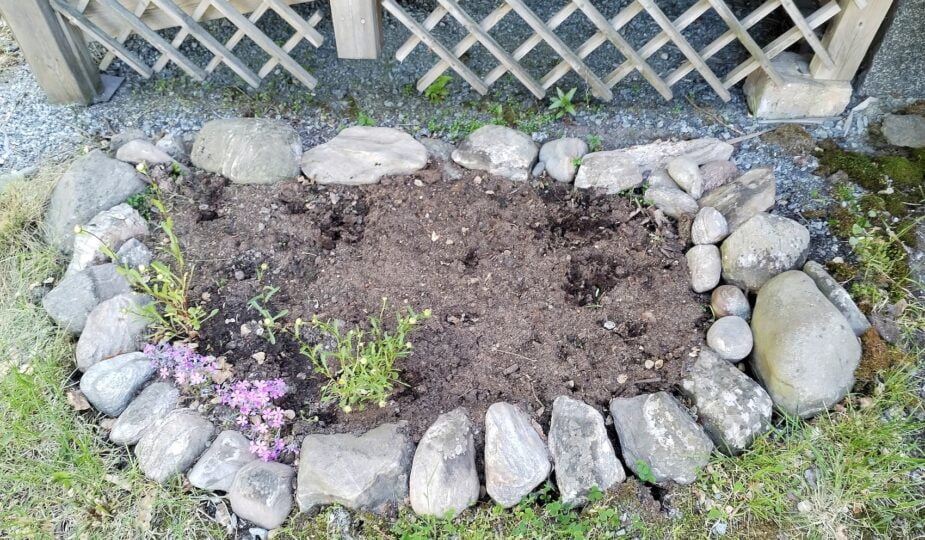 Isäntä kuitenkin yllätti ja kitki rikkaruohot (ja ehkä jonkun perennan 😀 ) pienestä kukkapenkistä, joka sijaitsee kuistimme kyljessä. Isäntä asetteli kukkapenkin reunakivet siististi ja kaatoi sinne reippaalla kädellä uutta multaa.