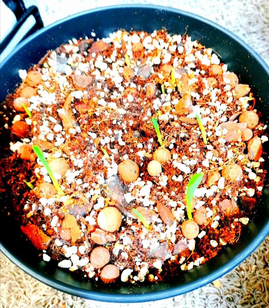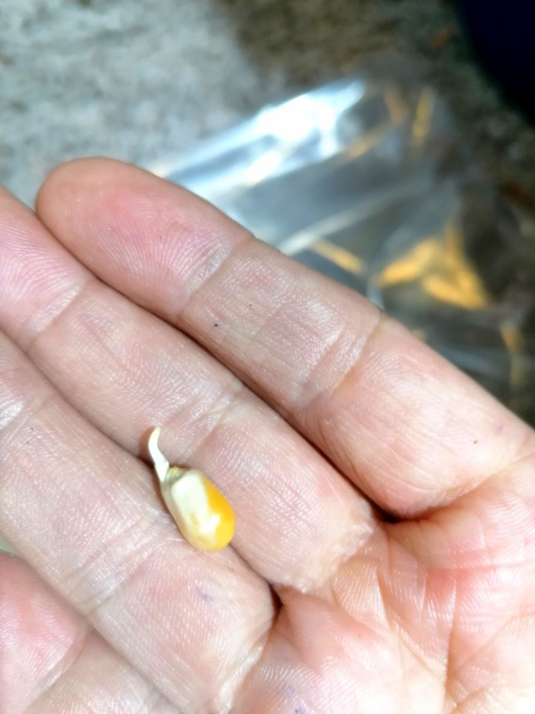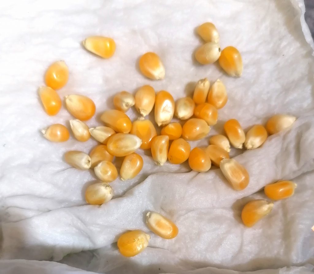Ennen istutusta laitoin siemenet märän käsipaperin sisään itämään. Itämisessä kesti kaksi päivää. Siirsin jyvät, jotka lähtivät itämään, ruukkuun, kun niissä oli puolisen senttiä nystyrää. Kylvön jälkeen kastelin kasvupohjan kunnolla merilevävedellä. En laittanut ruukkua kirkkaan muovipussin sisään, sillä jyvät ovat herkkiä homehtumaan. Niinpä sumuttelin kasvupohjan pinnan pari kertaa päivässä. Maissilla on kokoonsa nähden pienet juuret, joten varsinkin alkuun kasvupohja pitää pitää kosteana.