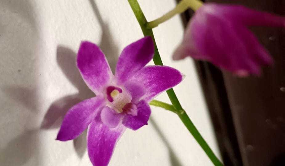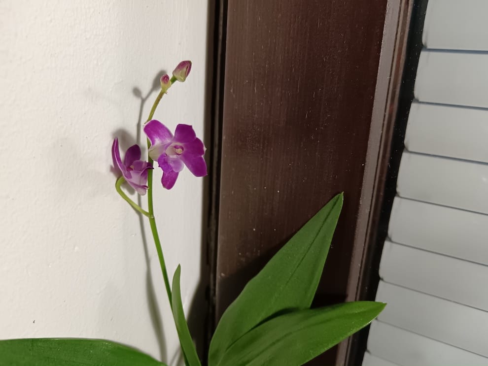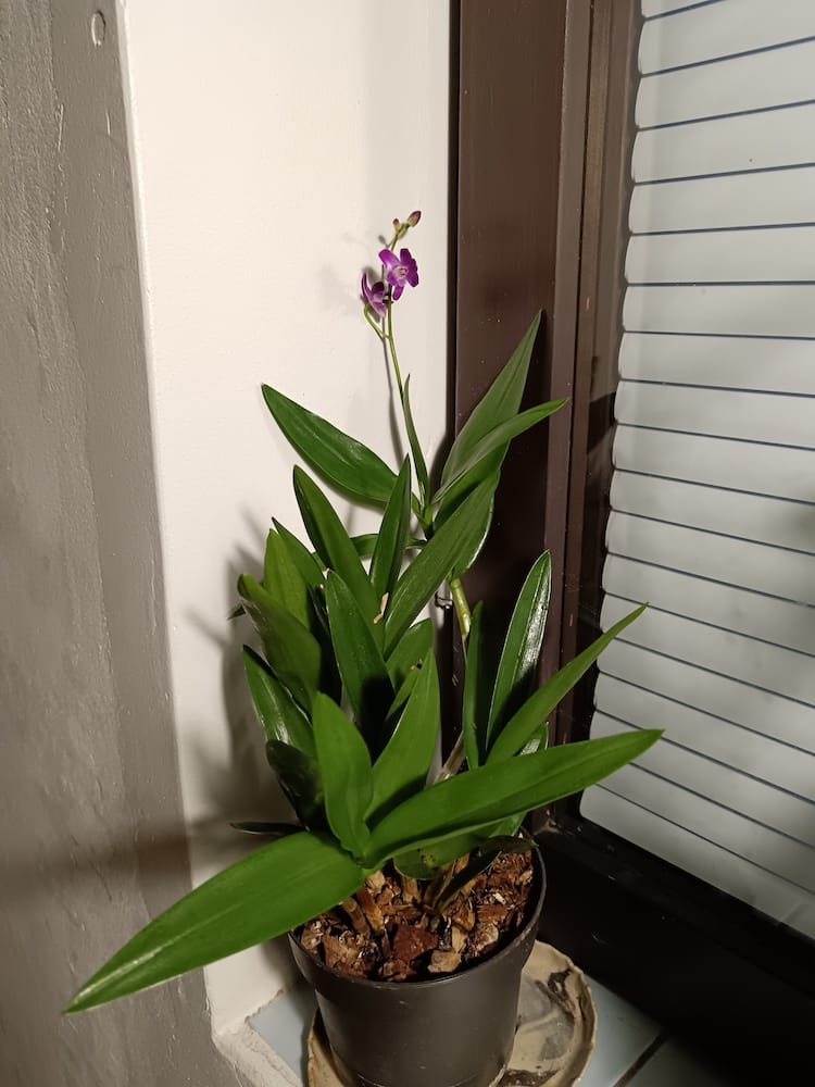 Sain tämän puikkokämmekän (Dendrobium Berry Oda) lahjaksi reilu puolisen vuotta sitten. Tullessaan se kukki runsaasti fuksian/lilan värisin kukin. Kukissa oli erittäin miellyttävä tuoksu, jonka haistamiseksi piti kuitenkin laittaa nenä aivan kiinni kukkaan. Kukinta kestää puikkokämmekällä useita viikkoja, jopa kuukausia. Kasvin lehdet ovat jäntevät, kapeat ja pystyt.