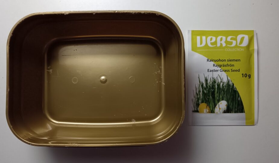 Sain koulutusreissulla Kaarinan K-marketista ilmaiseksi rairuohon siemeniä. En ole mikään pääsiäisihminen, enkä yleensä laita rairuohoa kasvamaan, kun lapsetkin ovat aikuisia. Mutta nyt kun sain siemeniä, päätin myös kylvää siemenet. Minulla olisi ollut kookoskuitua kasvupohjaksi, mutta säilytyslaatikko oli kaukana varastossa, enkä laiskuuksissani jaksanut hakea sitä tähän hätään.