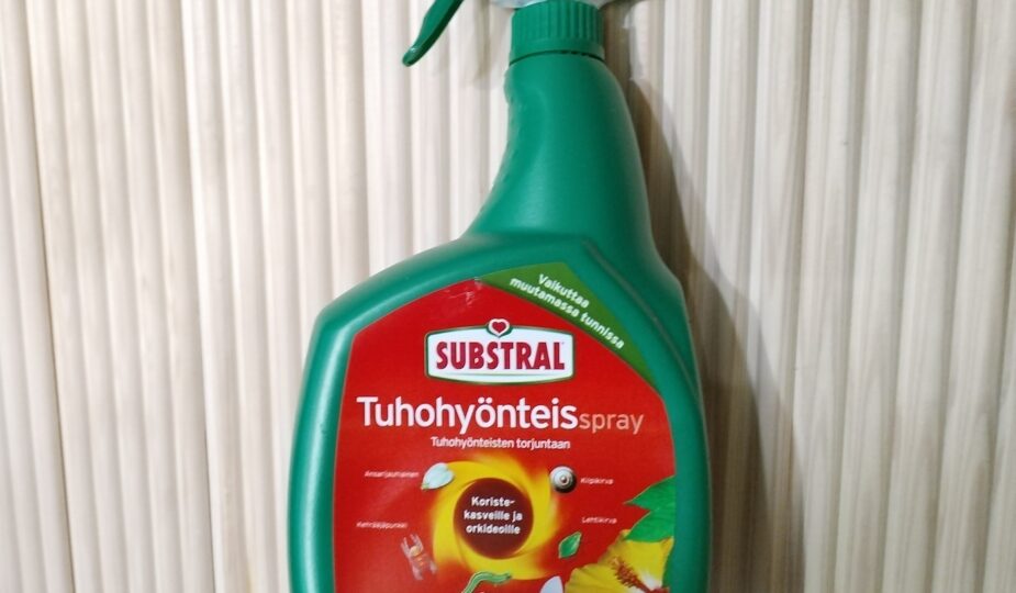 5. Substral tuhohyönteisspray kannattaa sumuttaa kasveihin muutama päivä pyretriinikäsittelyn jälkeen. Myrkky on systeeminen ja imeytyy kasviin, tehden siitä myrkyllisen sitä syöville tuholaisille jopa kolmeksi kuukaudeksi. Kaikki kodin kasvit pitää myrkyttää samana päivänä. Myrkkyä pitää sumutella reilusti kaikkiin kasvin osiin ja lehtien molemmille puolille.