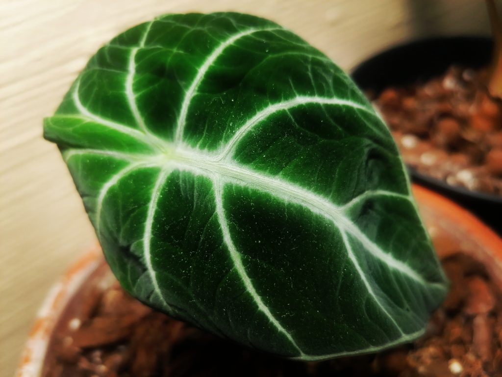 Alocasia Black Velvetillä on nimensä mukaisesti samettipintaiset, tummanvihreät lehdet, joissa on vaaleat lehtisuonet. Kasvi on pienikasvuinen ja lehdet ovat paksut ja tukevat.