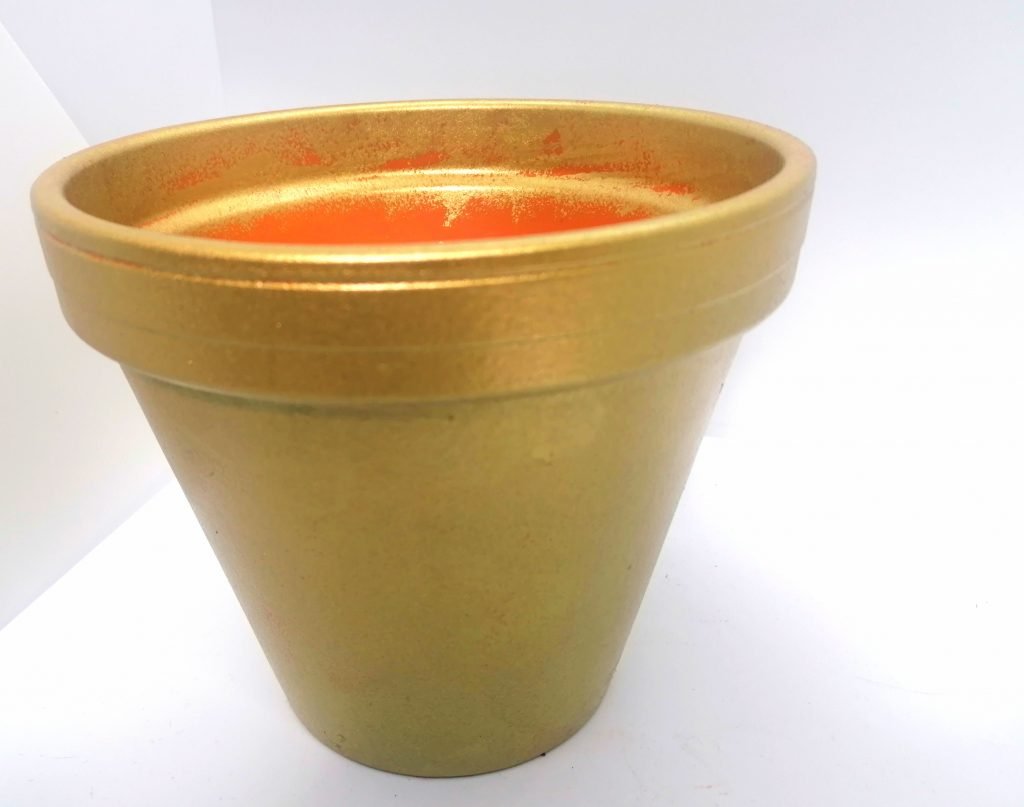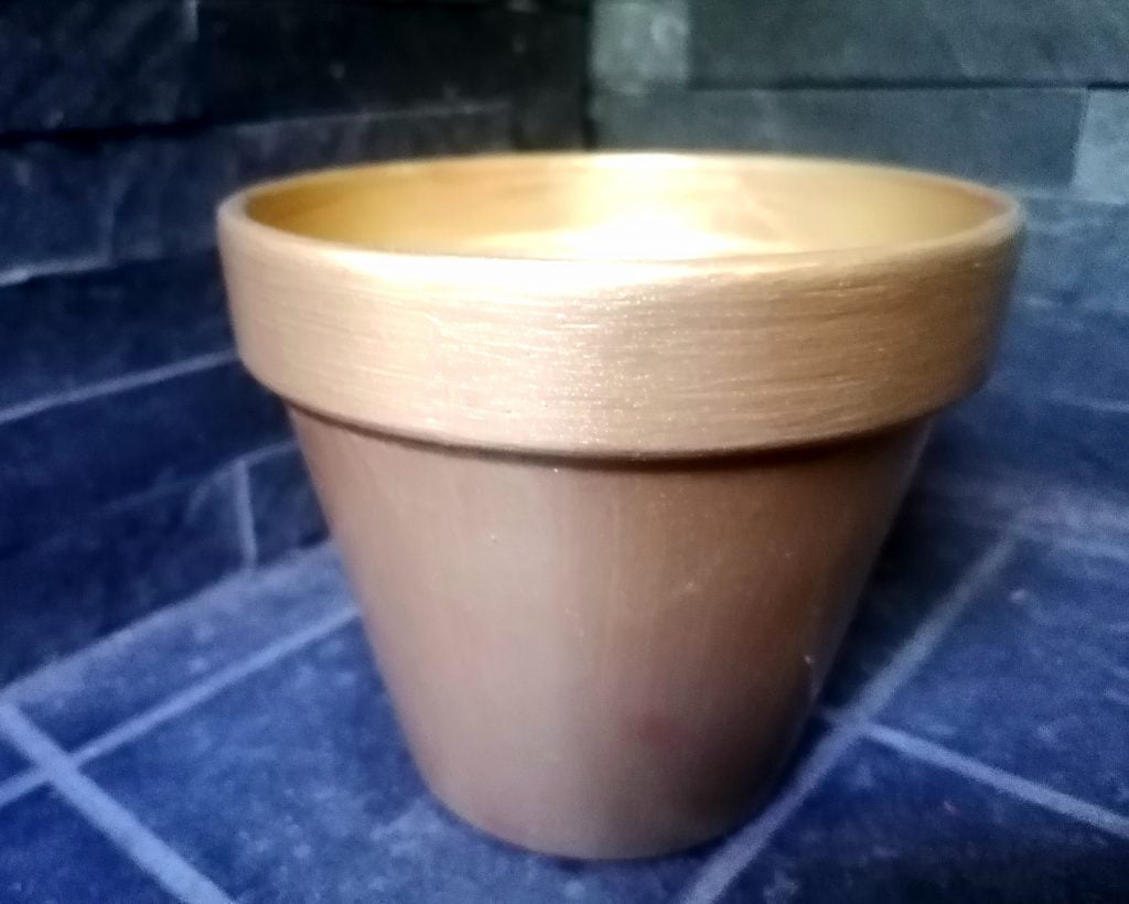 Toisena maalasin kultamaalilla isomman saviruukun. Vaihdoin tekniikkaa ja töpötin maalin ruukun pintaan pienellä sienellä. Maalasin vain yhden kerroksen, sillä se peitti ruukun melko hyvin. Pinta jäi mattaisemmaksi töpötysmetodilla kuin pensselillä maalattaessa. Maalasin myös ruukun yläosan sisäpuolelta, jotta mullan pinnan yläpuolelle näkyviin jäävä sisäpintaosa ruukusta ei ole erivärinen kuin ulkopinta.