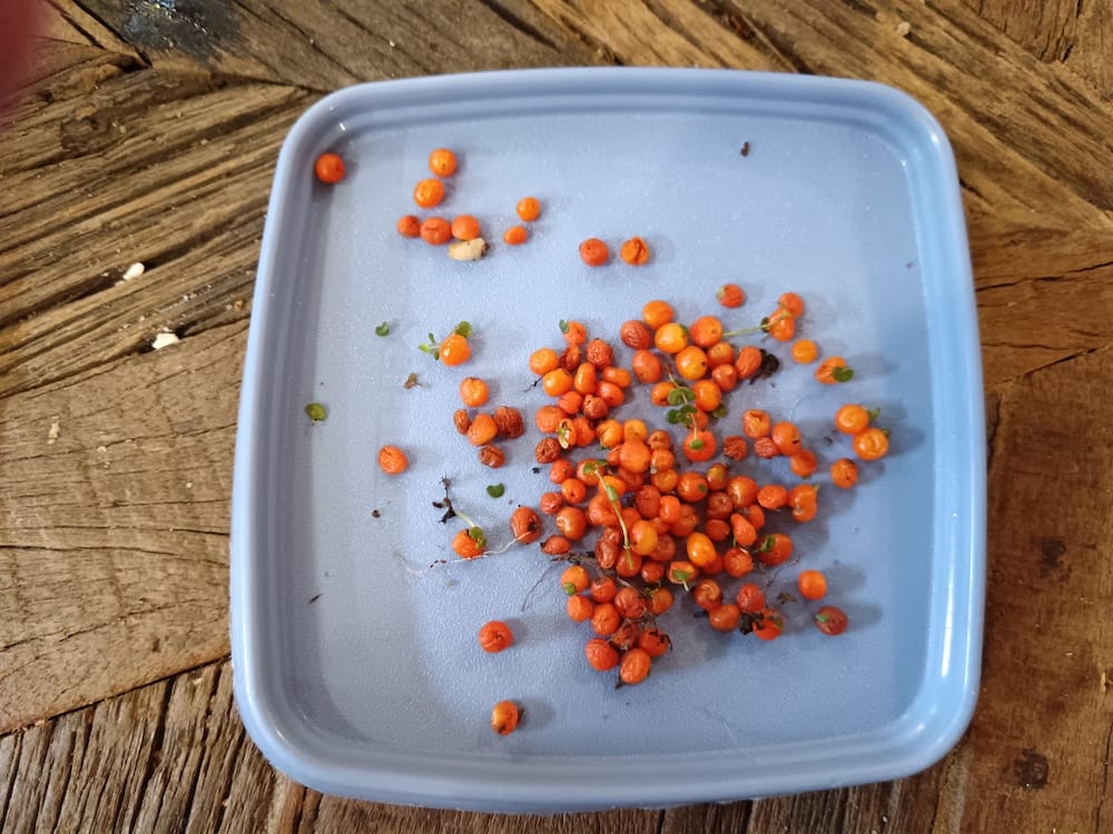 Puristin marjaa sormieni välissä, jolloin esiin pullahti kaksi toisiinsa kietoutunutta siementä. En ole varma marjojen myrkyllisyydestä, joten käytin alkuun hommassa kumihanskoja. Hyvin pian paljastui, että työ on hanskat kädessä täysin mahdotonta. Niinpä päädyin halkomaan marjoja paljain käsin. Sormet värjäytyivät oransseiksi, mutta muuta iho-oiretta en onneksi saanut käsiini. Kaivelin siemeniä ylös joitain kymmeniä.