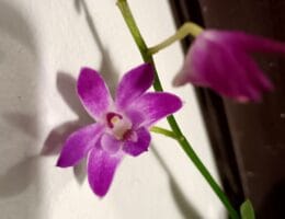 Sain tämän puikkokämmekän (Dendrobium Berry Oda) lahjaksi reilu puolisen vuotta sitten. Tullessaan se kukki runsaasti fuksian/lilan värisin kukin. Kukissa oli erittäin miellyttävä tuoksu, jonka haistamiseksi piti kuitenkin laittaa nenä aivan kiinni kukkaan. Kukinta kestää puikkokämmekällä …
