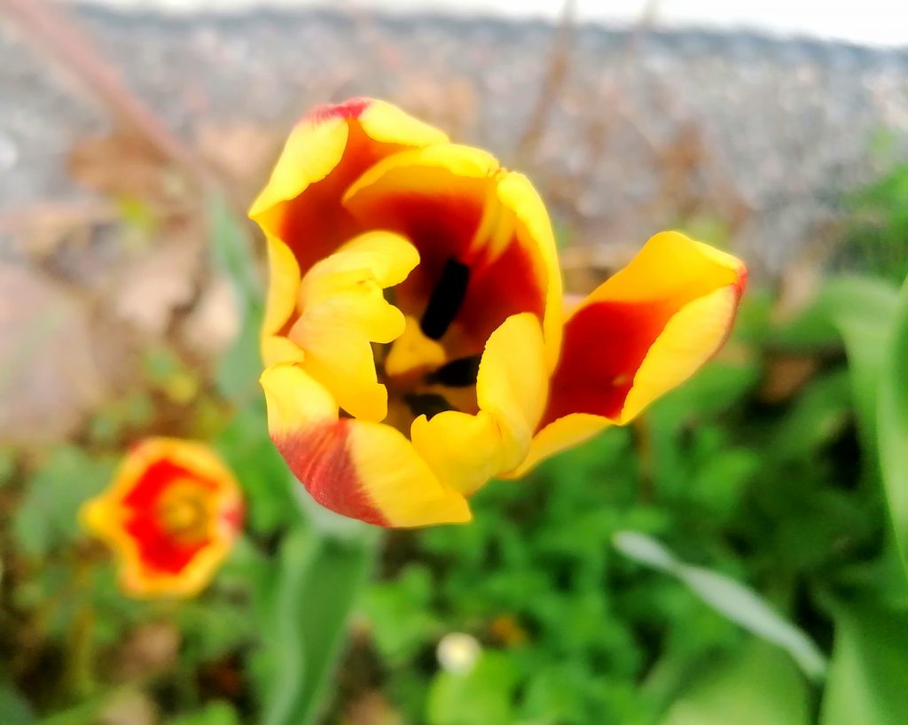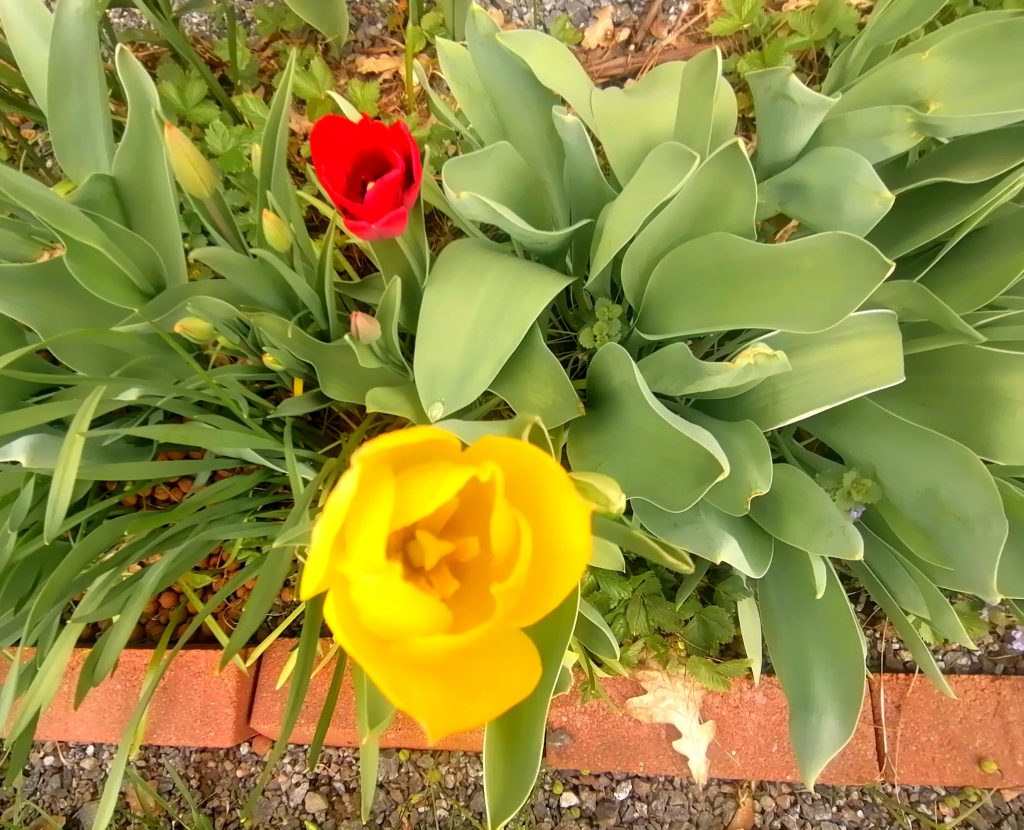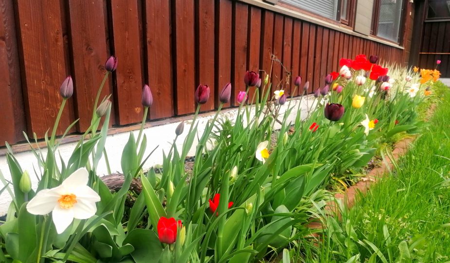 Eteläseinustalla kukkapenkki suli jo aikaisin keväällä. Narsissit pääsivät kukintaan jo viikko pari sitten ja nyt lämpimät ilmat saivat vihdoin tulppaanitkin nousemaan ja aukeamaan. Edellisvuosina istutetut tulppaanit selvisivät myös talvesta ja olivat tehneet reippaasti sivusipuleja. Kukkapenkkiin aukenikin oikea kukkameri monine väreineen iloisessa sekasotkussa.