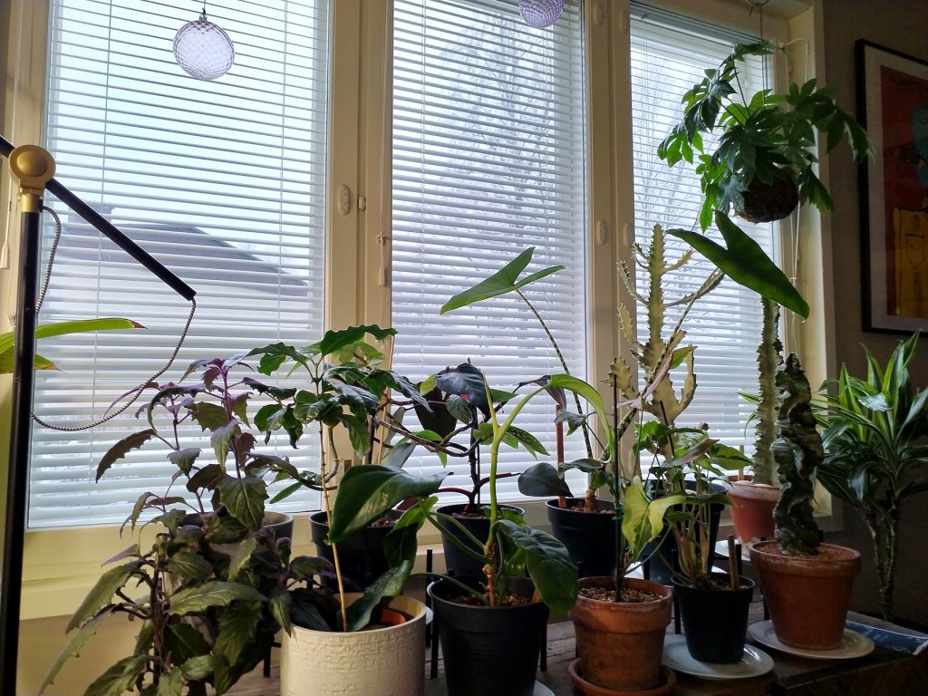 Suurin osa kasveistani on keinovalojen alla ympäri vuoden, nämä kasvit saavat lannoitetta talvellakin. Uudessa kodissamme on melko vähän ikkunatilaa kasveille. Olohuoneessa ja makuuhuoneessa on molemmissa puolisentoista metriä eteläikkunaa. Lastenhuoneista löytyy itä- ja länsi-ikkunat, mutta en ole viitsinyt vallata lastenhuoneita kasveilla. Myös muutama pohjoisikkuna löytyy, mutta niiden edessä ei kasveille ole tilaa.