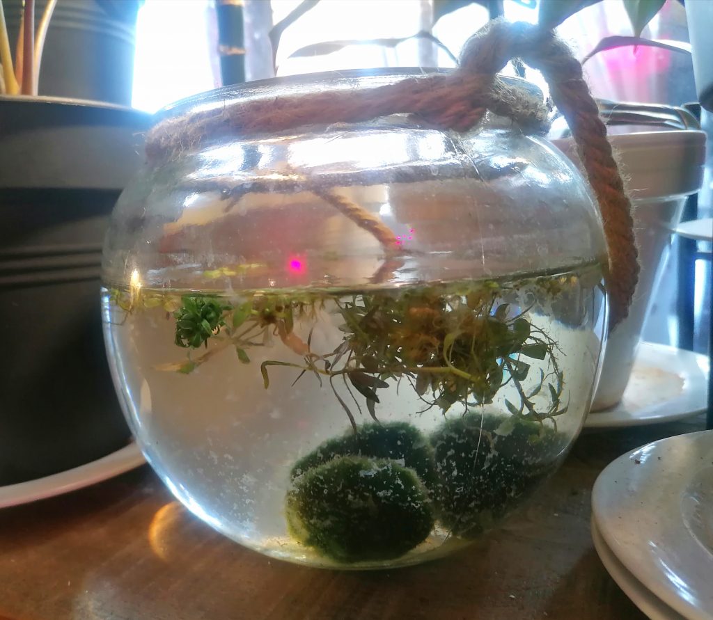 Toinen maljoista oli ensin pimeähköllä ruokailupöydällä, mutta siirsin sen valoisampaan paikkaan, kun vesikasvit alkoivat kellastua. Nyt molemmat maljat ovat itäikkunalla, missä ne saavat vielä tähän aikaan vuodesta lisävaloa. Kasvien kellastuminen loppui valomäärän lisääntyessä.