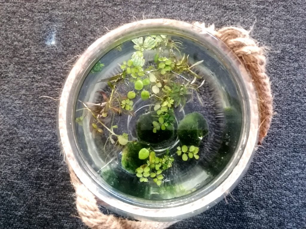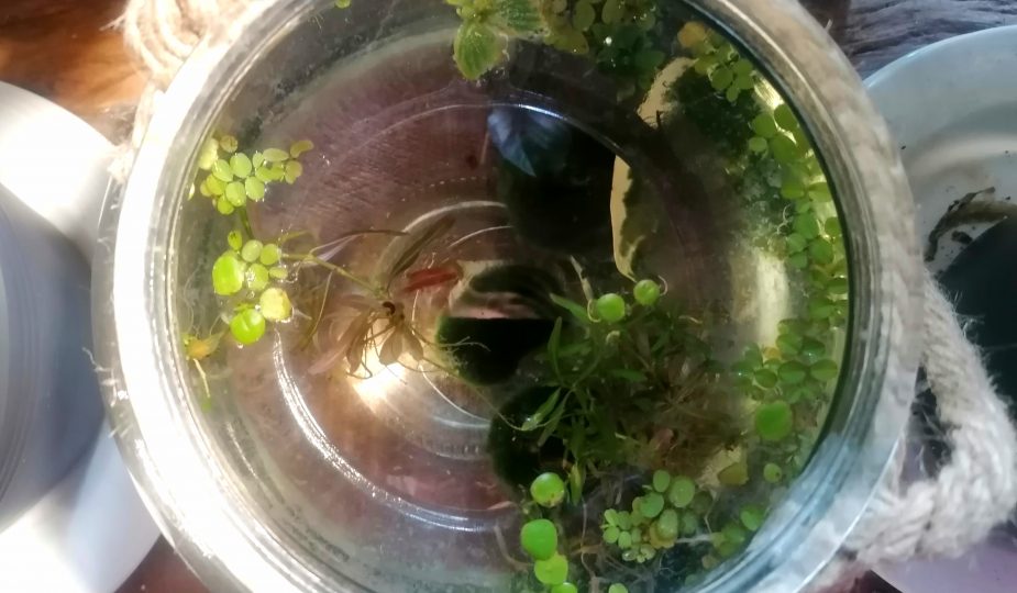 Vettä olen vaihtanut astioihin noin kahden viikon välein. Koska en laittanut pohjalle hiekkaa/kiviä, on veden vaihto melko nopea homma.