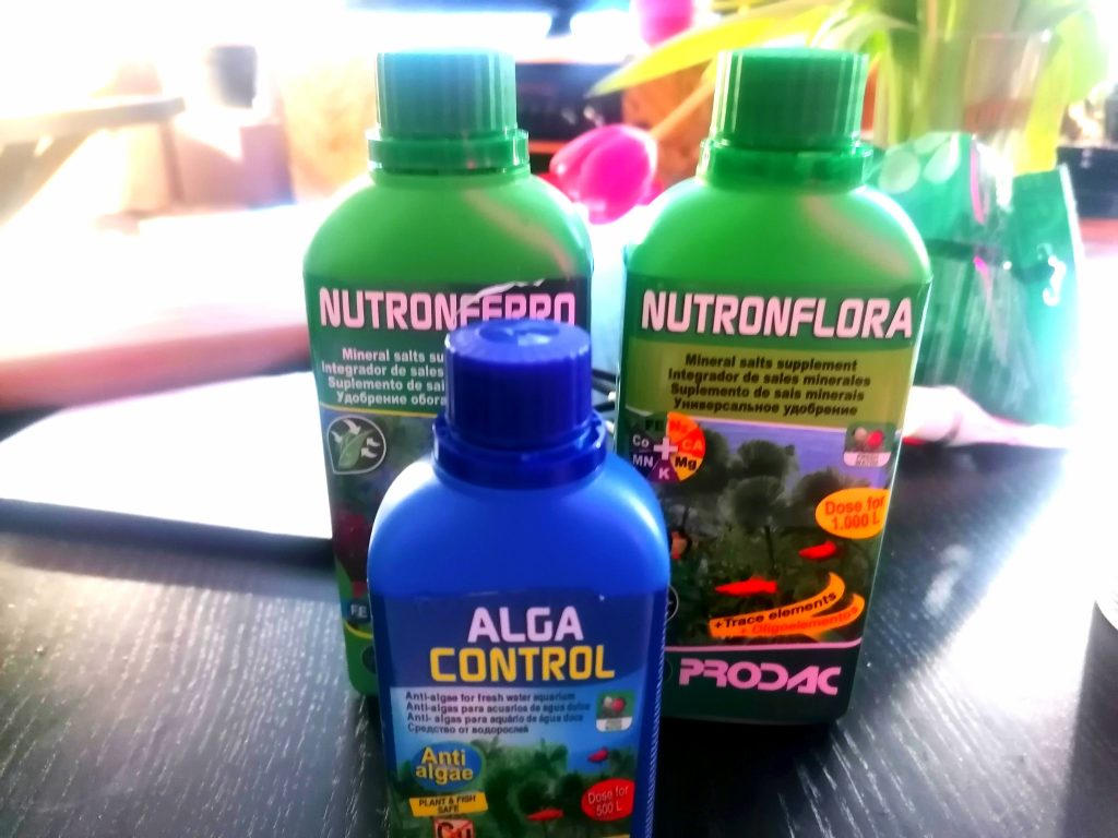 Lopuksi laitan muutaman tipan vesikasveille tarkoitettua ravinnetta ja levänestoainetta (Prodac Algacontrol). Ravinteita minulla on kahta erilaista, joita vuorottelen. Toisessa ravinteessa (Prodac Nutronferro) on rautaa sekä magnesiumia ja toisessa (Prodac Nutronflora) taas muita kivennäisiä. Lannoitteet ovat riittoisia, yhdestä pullosta saa 1000 litraa lannoitettua vettä.