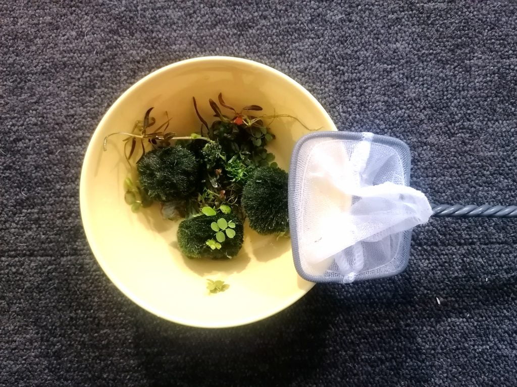 Ostin Faunattaresta pienen akvaariohaavin, jolla kerään kasvit ensin pois astiasta. Tämän jälkeen kaadan veden pois vesimaljasta ja täytän sen uudelleen noin kädenlämpöisellä vedellä. Sitten poistan kasveista kellastuneimmat lehdet. Se onkin hieman vaikeampaa, kun märät kasvit tarttuvat sormiin kiinni.