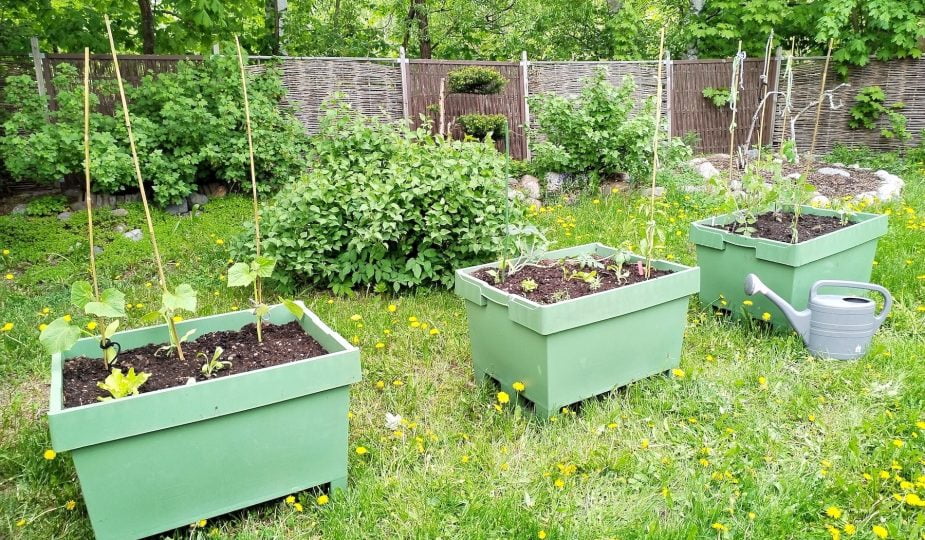 Itselleni laatikoihin tuli tänä vuonna eri tomaatteja, kurkkua, salaatteja, yrttejä, paprikaa, papua, hernettä ja uutuutena vesimelonia, jonka viljelystä minulla ei ole mitään kokemusta saati tietoa. Istutin taimet heti laatikoiden saavuttua. Kastelin laatikoita hieman, sillä istutuspuuhien kesken ilmestynyt reipas sade hoiti kastelusta pääosan. Istutuksen yhteydessä laitoin istutuskuoppien viereen aina pikkuisen läjän kanankakkaa, josta kasvit juuria kasvatettuaan saavat ravinteita.