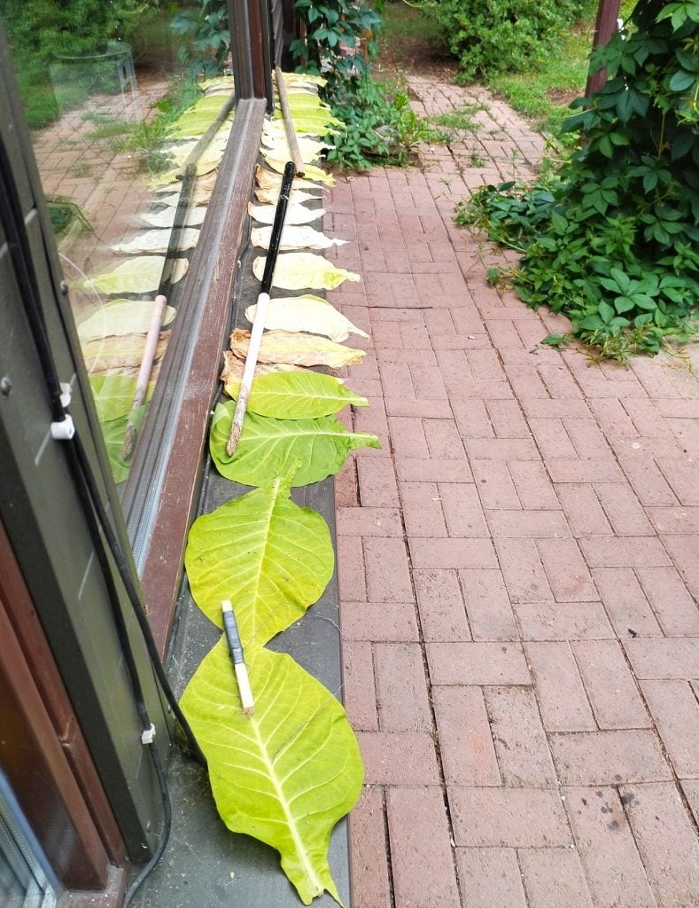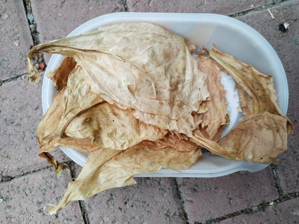 Jatkan alimpien lehtien keräämistä, kunnes kelit menevät kylmiksi. Silloin nostan tupakat sisälle valon alle tai katkaisen jäljellä olevan latvan kokonaisena sisälle kuivumaan. En ole vielä varma taktiikasta, riippuu hieman jäljellä olevien lehtien määrästä. Jos lehtiä on syksyllä vielä paljon, jatkan kasvien hoitamista sisällä.