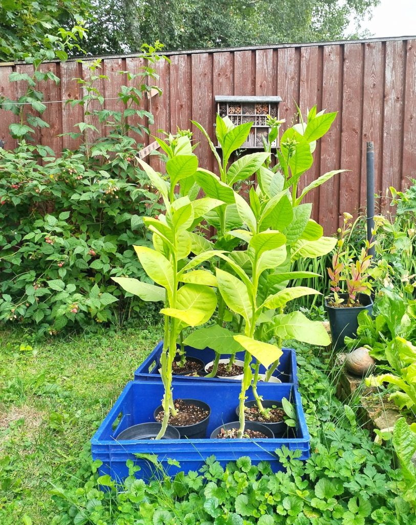 Laitoin virginiantupakat kasvamaan loppukeväästä, kun isäntä sai päähänpiston, että haluaa oppia tekemään nuuskaa. Parempi aika kylvämiselle olisi ollut alkukevät, mutta onnistui niiden kasvatus vähän myöhässäkin. Tupakat pääsivät hieman ennen juhannusta ulos ruukuissa ja niiden kasvu on ollut nopeaa. Nyt kasveilla on korkeutta noin 120 cm.
